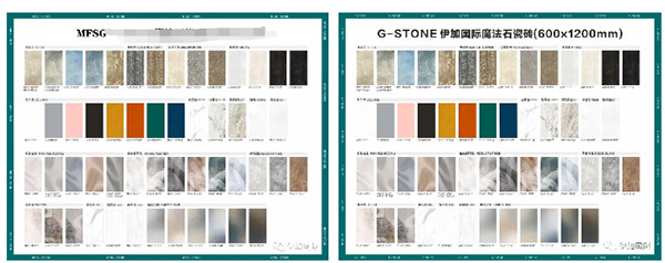 左圖是自稱“MxxG-STONE”的產品單張,右圖是G-STONE伊加國際魔法石瓷磚單張